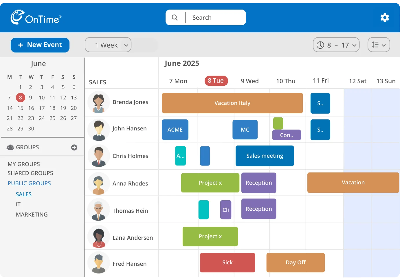 OnTime is a group calendar solution that takes the chaos out of scheduling and keeps teams in sync. All calendars come together in one simple, visual view so you can instantly see availability, find the right people, and book meetings.
