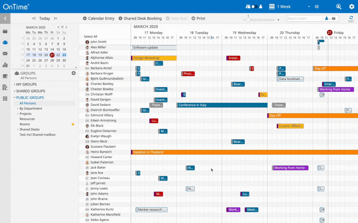Die intuitive Benutzeroberfläche und die erweiterten Funktionen von OnTime ermöglichen Teams ein effektiveres Zeitmanagement. Sie überwinden die Einschränkungen des neuen Outlook und bieten ein leistungsstarkes Tool für Planung und Koordination. Auf einen Blick sehen Sie mehrere Dutzend Personen bis zu neun Wochen im Voraus. So können Sie die Verfügbarkeit Ihres Teams oder Ihrer Organisation schnell überprüfen und Ihre Zeit optimal nutzen.