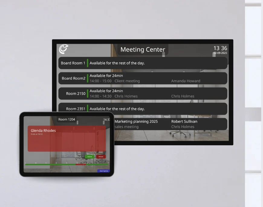 Calendars show everything as occupied, yet many “booked” rooms are empty because meetings end early or no one shows up. Meanwhile, teams waste time searching for available space or interrupting others to check. Without an overview, teams waste time searching for space, and meeting rooms never get used to their full potential.