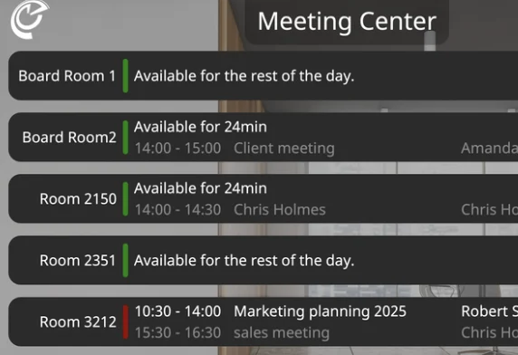 With Room Display, it’s easy to see if a room is free or occupied — green means available, red means in use. You can also view the full day’s schedule to know when it’s free next.