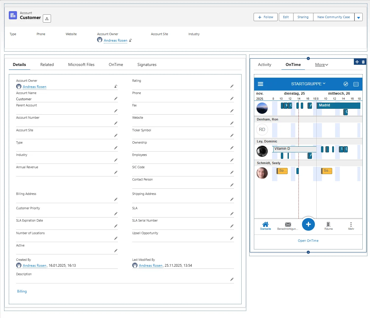 This is precisely where the solution comes in: Ontime, an integrated widget that appears directly within the opportunity and in this example automatically retrieves the appropriate account team. Within the opportunity, you can immediately see the availability of all relevant team members – without additional tools, without calendar tweaks, and without manual coordination.