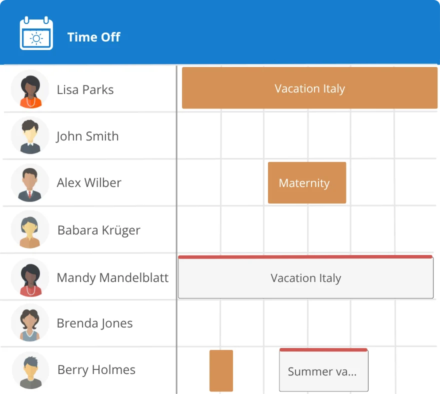 OnTime eliminates the need for external vacation planning tools. The Time Off workflow gives you a clear overview of where colleagues are
