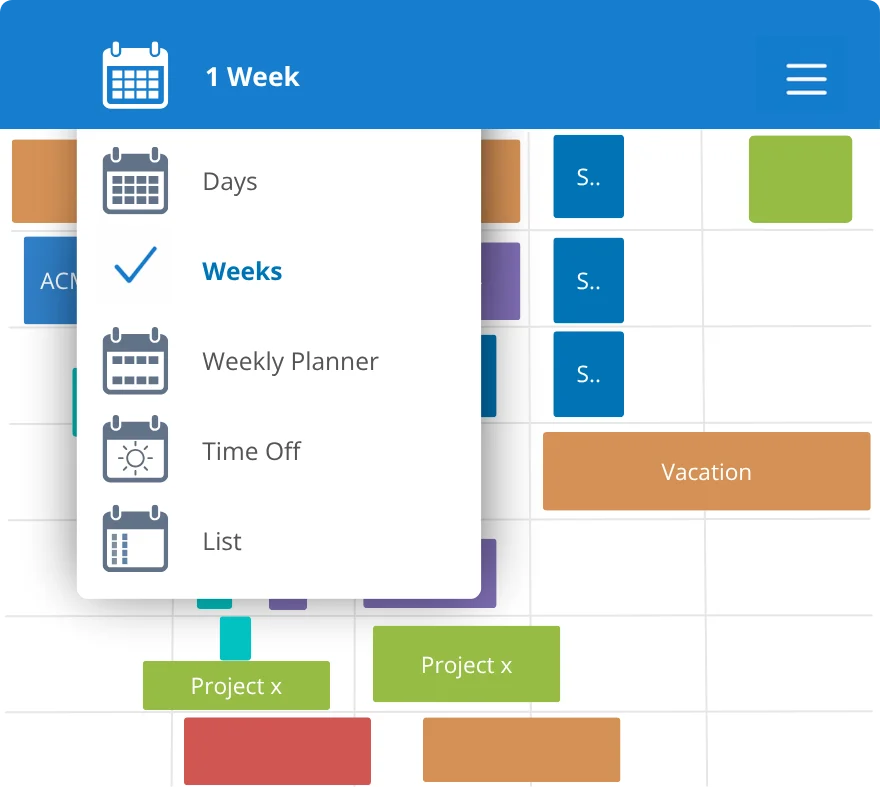 Work the way that suits you best. Choose between day view, week view, weekly planner, time-off, or list view to match your workflow. Tailor your time horizon, decide how many people to include– all with seamless navigation that keeps you in control and ensures you always have the overview you need.